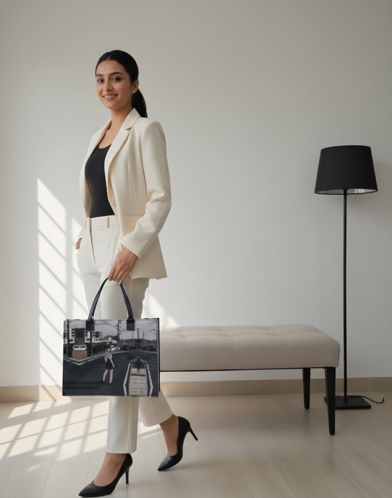 Women’s Tote Bag with Traditional Warli Art Print, Faux Leather Trim, Spacious Shoulder Carry Bag for Office & Travel, Black Multi-color