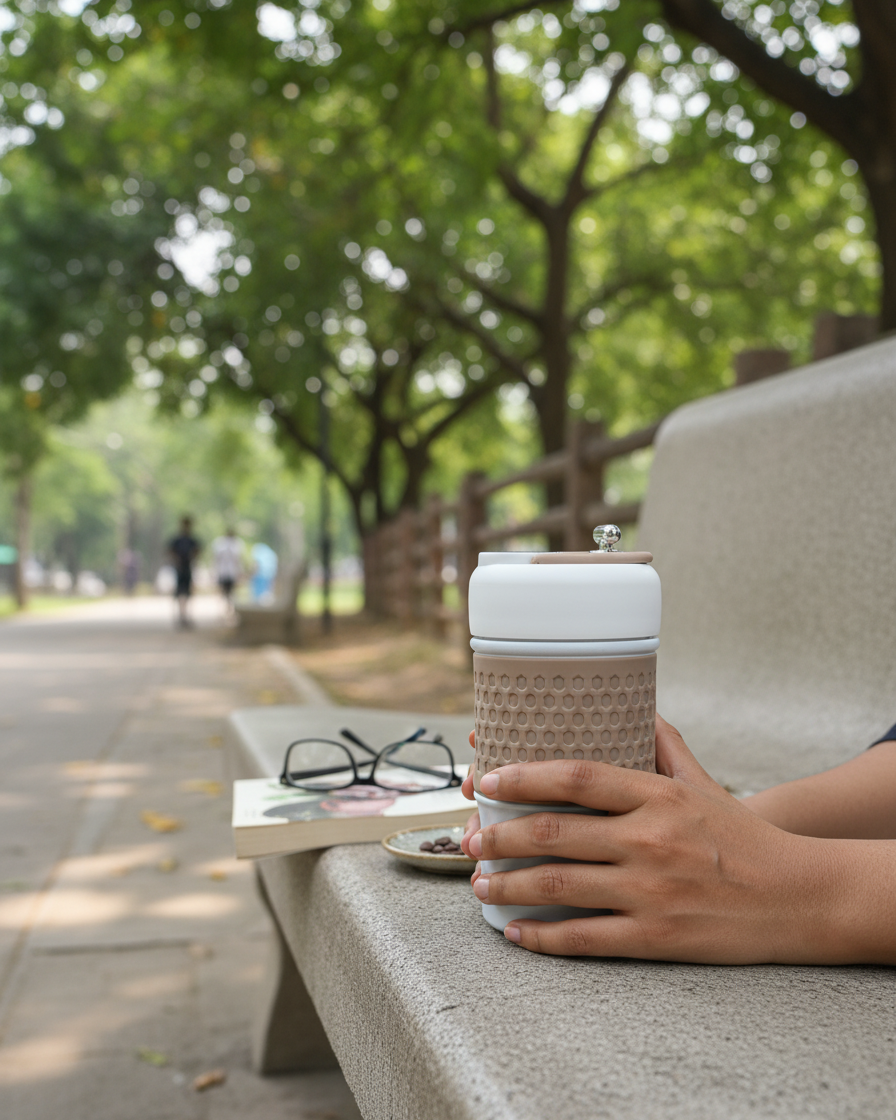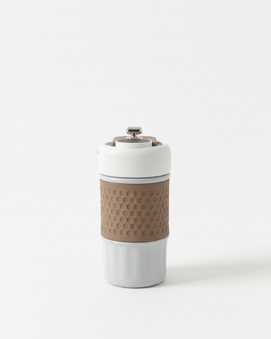 The mug features a leakproof lid with push-button opening, making it easy to drink on the go while preventing spills. Its ergonomic textured grip provides a comfortable hold, and the portable strap handle makes carrying effortless during travel, commuting, or outdoor activities.